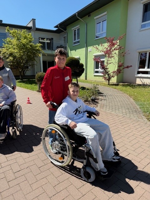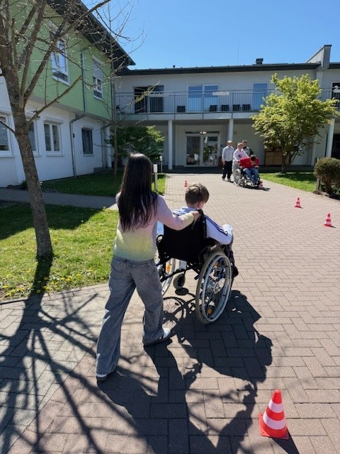 Die Jugendlichen durften Hindernisse umfahren, Bordsteine überwinden und dabei sowohl in die Rolle des Pflegenden als auch des Rollstuhlfahrers schlüpfen. Diese Perspektivwechsel waren nicht nur lehrreich, sondern haben den Teilnehmern auch sichtbar Freude bereitet.