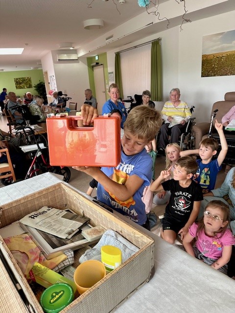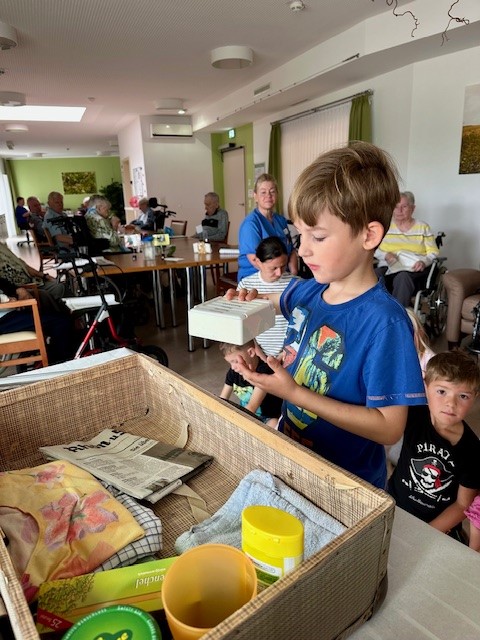 Ein Koffer, gefüllt mit Symbolen aus dem Alltag. Sabrina Wehner zeigte den Kindern mithilfe des besonderen Koffers auf, wie die Senioren bei uns leben und wie die Pflege im Alltag aussieht. Die Kinder konnten so hautnah erleben, was hier passiert und welche Aufgaben unsere Mitarbeitenden täglich übernehmen.
